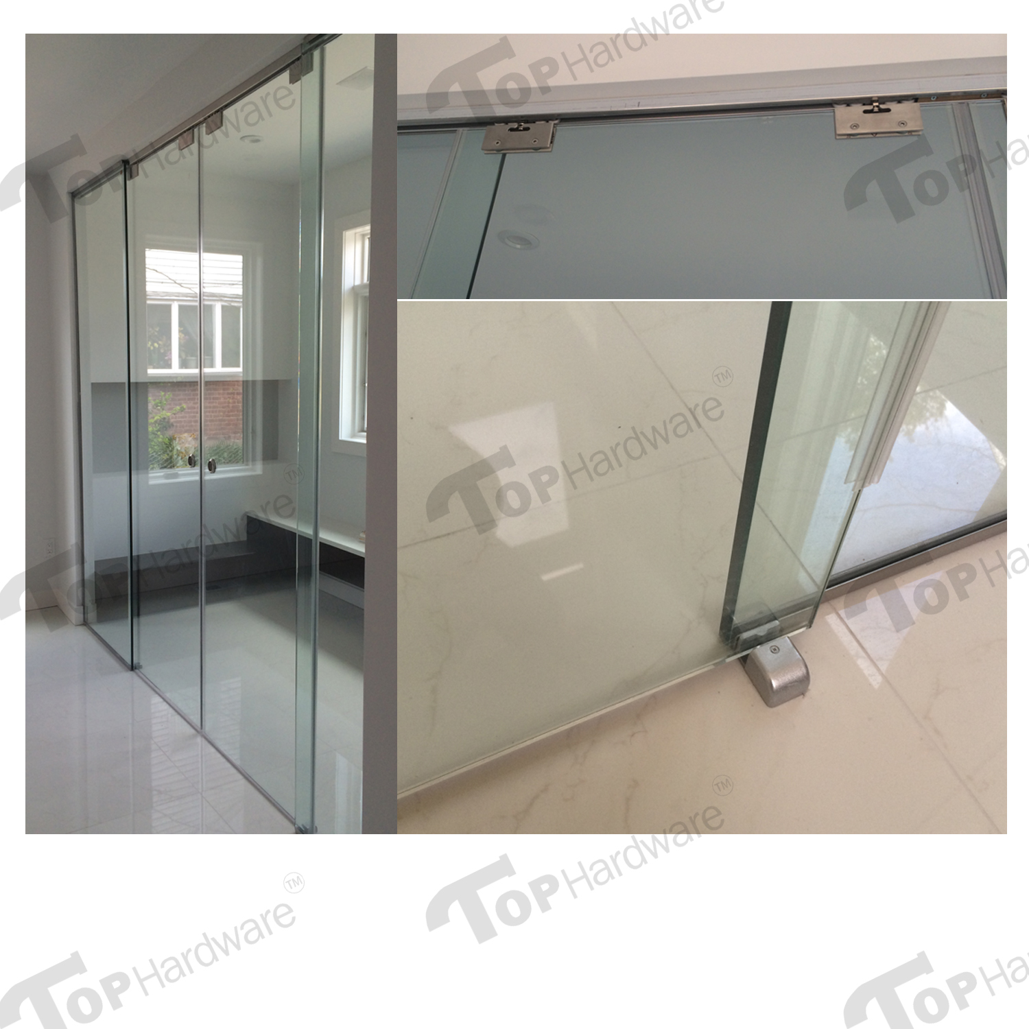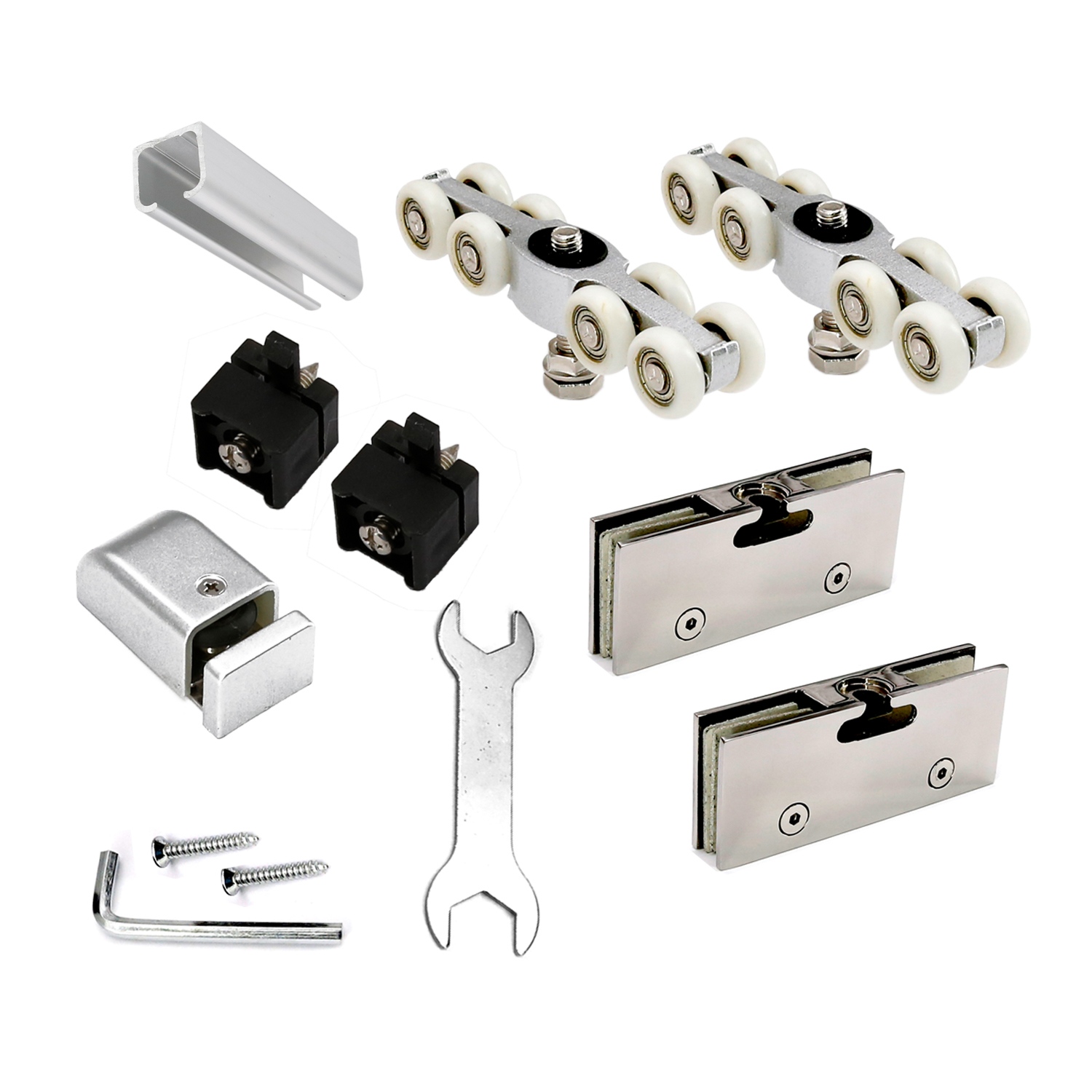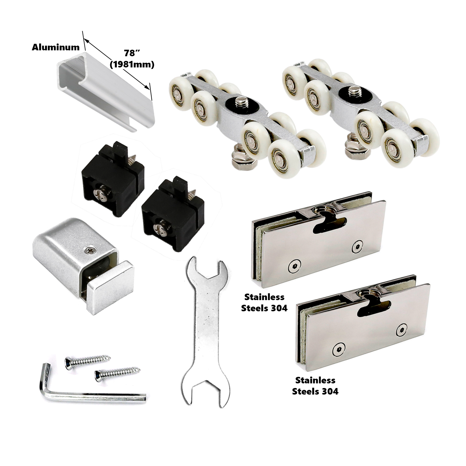 - Package Includes: (1) 78″ Rail (2) Glass Clamp (2) Rollers (2) Door Stops (1) Floor Guide