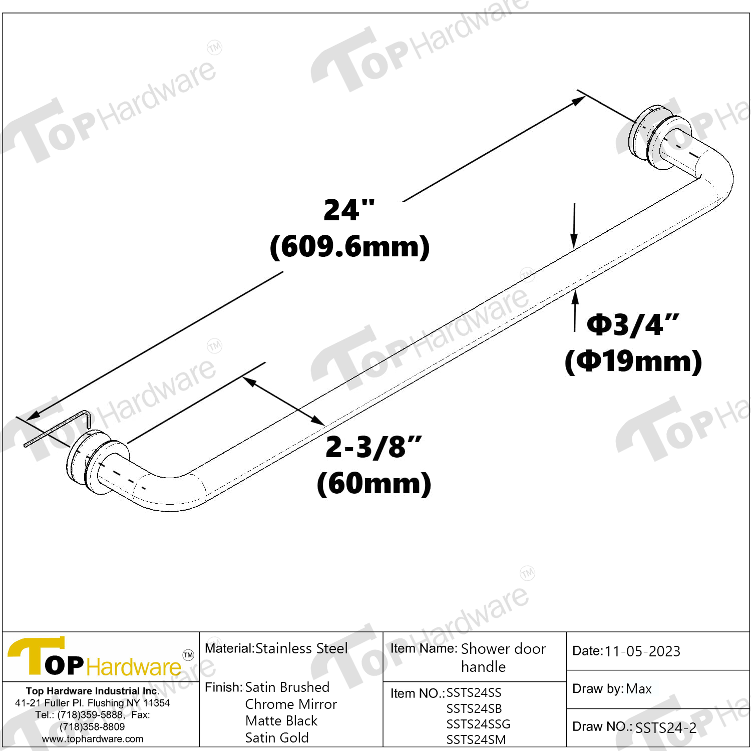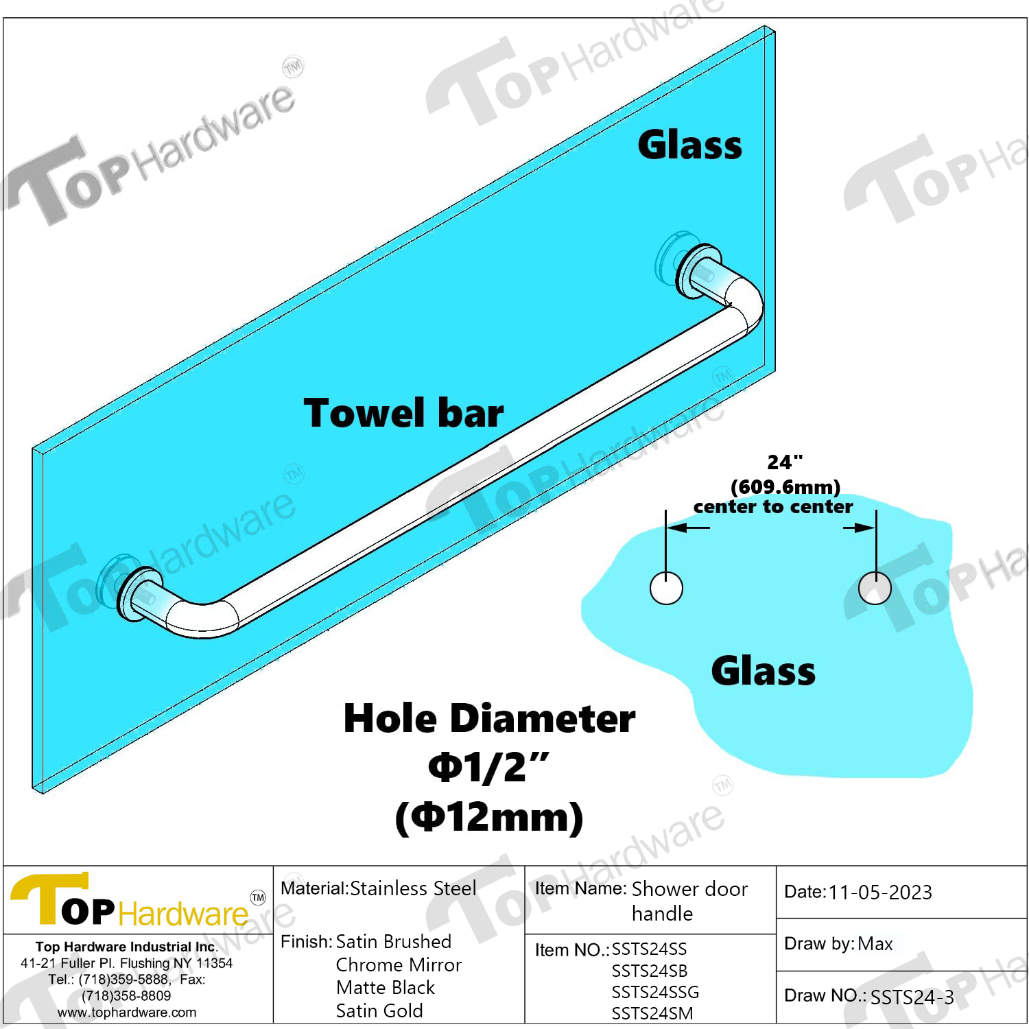 (SSTS24_) Stainless Steel 24-inch Shower Glass Door Single Side Round Shape Towel Bar