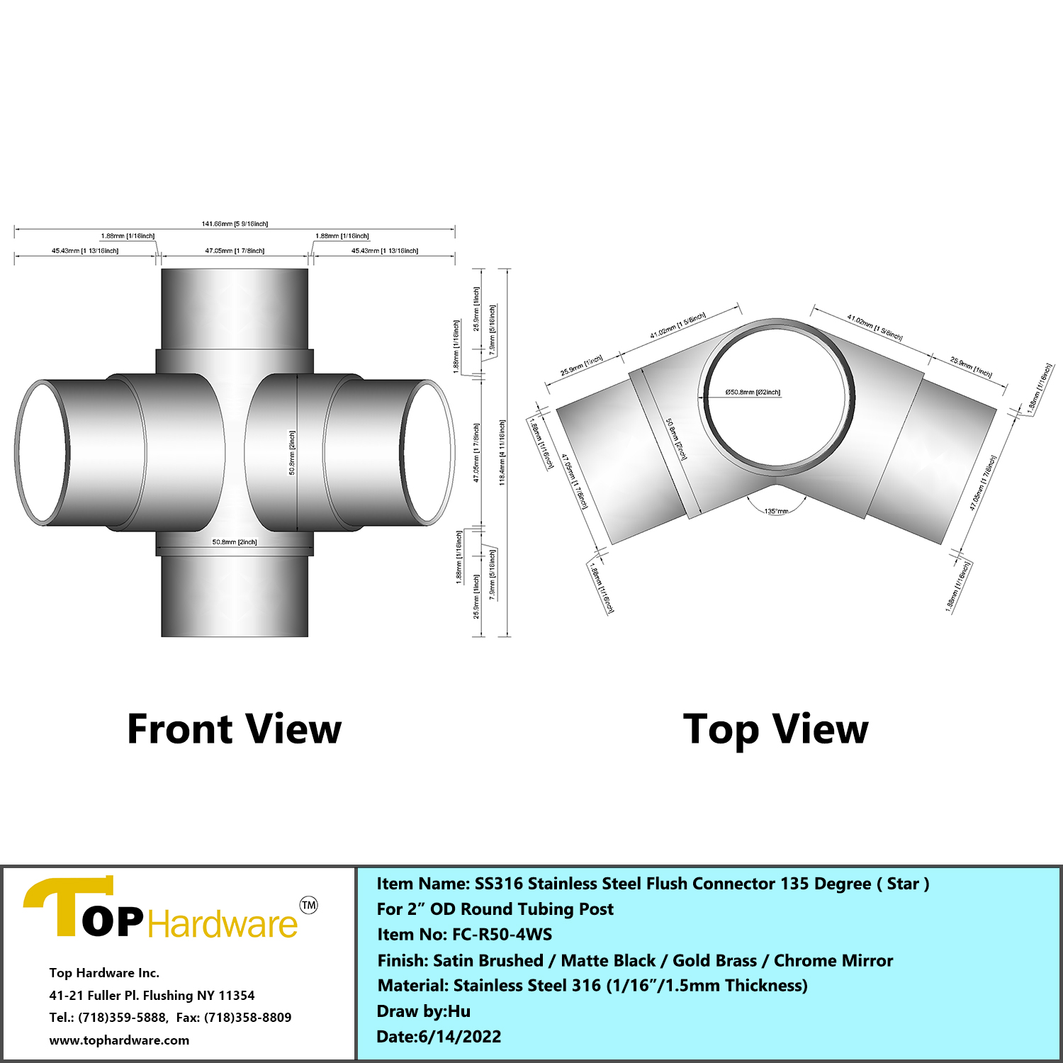 - 4 way flush joiner/elbow makes multiple pipe connection easy, fits 2″ diameter pipes. 135-degree bend in the center, made of #316 stainless steel
